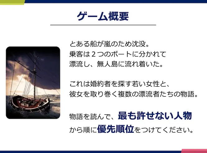 「無人島SOS」以外にも答えがないコンセンサスゲームとして、「無人島での出来事」があります。