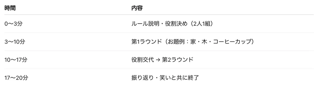 短時間のアイスブレイクとしても、時間をかけたワークショップとしても活用でき、目的や参加者のレベルに応じて設計可能です。