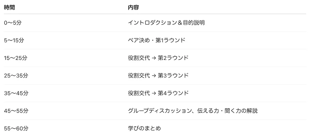 もう少し研修ぽく1時間で実施するのであればこのようなタイムラインが考えられます。