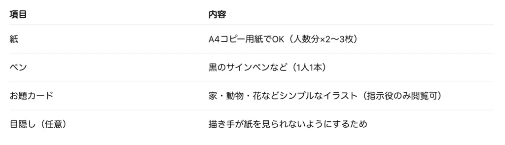 描き手は完成図を見ず、指示役の言葉だけを頼りに絵を描くため、言葉の伝え方や聞き方に工夫が求められます。