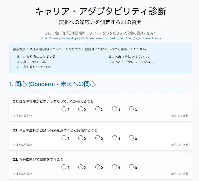 塩川 太嘉朗, 保田 江美, 中原 淳(2024)『日本語版キャリア・アダプタビリティ尺度の開発:若年労働者を対象とした信頼性・妥当性の検証』キャリア・カウンセリング研究 26巻1号 p.1-12