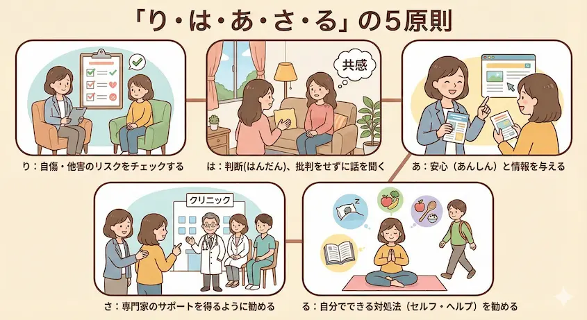 では、具体的にどうようにしたらメンタルヘルス・ファーストエイドができるのでしょうか?その答えは「り・は・あ・さ・る」の5文字で表されます。