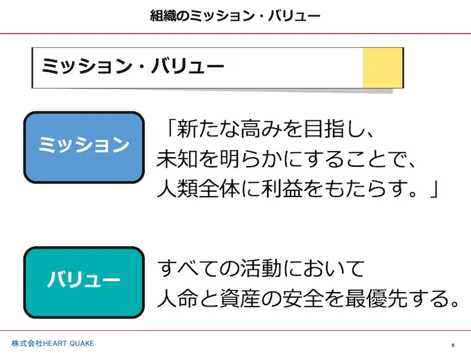 理念浸透を目的としてNASAゲームを実施する際には、ゲームの設定に組織のミッションとバリューというスライドを追加し、組織のミッション・バリューを説明します。