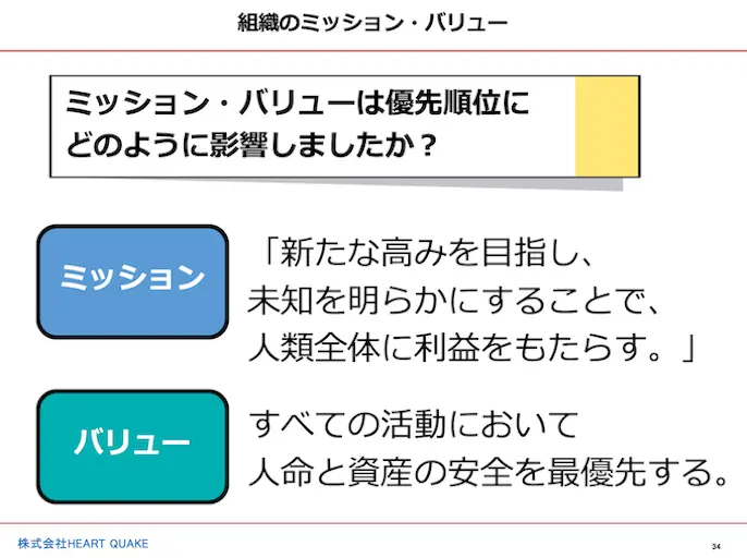 ここで言いたいことは、ミッション・ビジョン・バリューを全員が理解できているかどうかが重要だということです。NASAゲームでも同様ですが理念が共有されていないと(浸透していないと)物事の優先順位が大きく変わってしまいます。