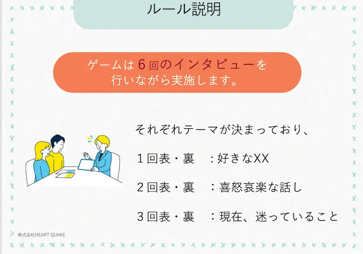 このゲームは受講者にルールが説明されてない(いきなりゲームが始まる)という少し変わったゲームで、混乱を生むゲームです。