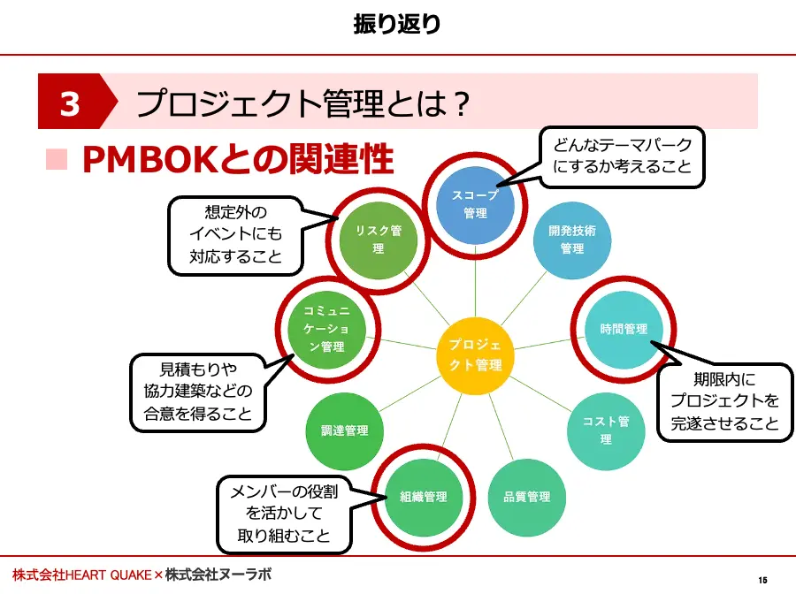 ゲーム後はPMBOKとゲームを絡めてプロジェクトマネジメントに必要な要素について伝えていきます。