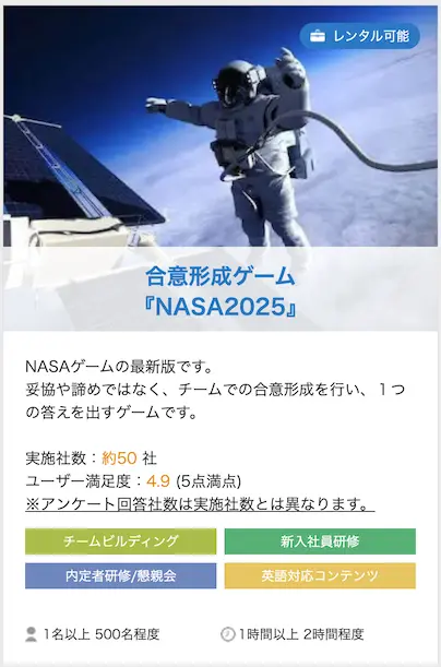 なお、弊社では月での遭難 in 2025(NASAゲーム2025)を実施できるツール(カード,ボード、ワークシート、運営マニュアル)を提供しています。通常のNASAゲームだと過去にやったことがある人がいるかも知れないという場合は月での遭難 in 2025を選択することができます。