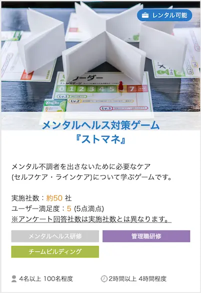 なお、弊社では、講師派遣型はもちろん、社内講師で実施できるキットとしてカードなどのゲーム備品、投影用スライド(pptx形式)、講師向けの動画マニュアルのレンタルを行っております。