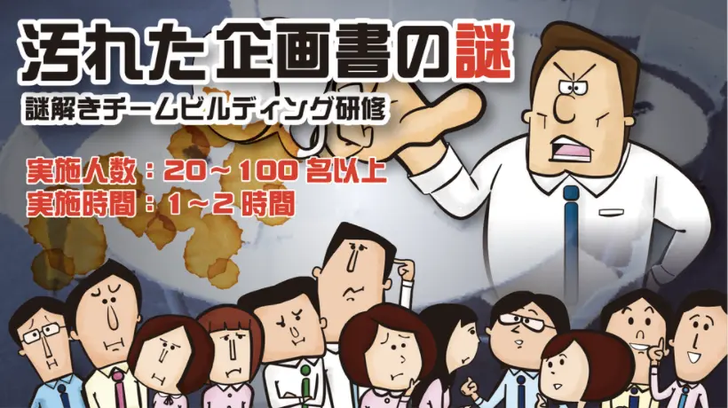 | 汚れた企画書の謎 | 5万円〜 | 40〜100名以上 | 30分〜1時間 | 役割分担・謎解き |