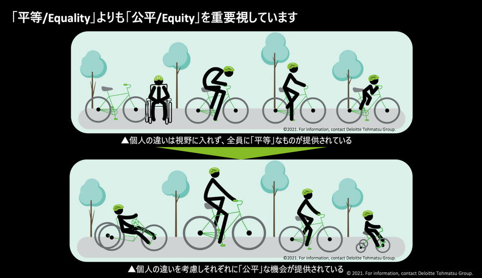 また、デロイトトーマツ社では、全員が平等かつ、公平な機会を保持していることが理想形だと記載されています。