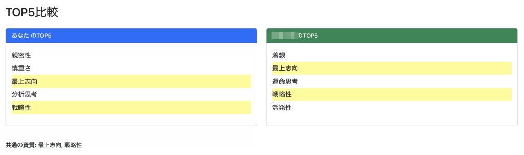 また、私とXXさんの上位資質で共通している資質を比較して表示することも可能です。