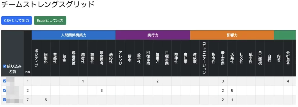 なお、弊社では独自のシステムを開発し、チームストレングスグリッドをより便利に使えるように工夫しております。