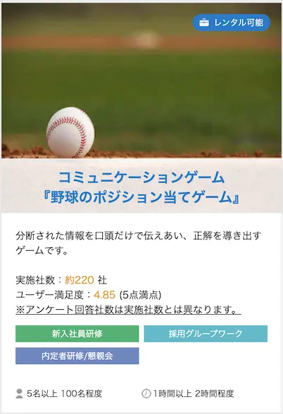 2026年2月現在、弊社での野球のポジション当てゲームの導入社数は約220社、受講者満足度は4.85(5点満点)となっております。