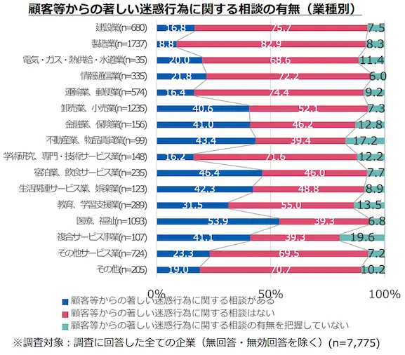 厚労省の調査では、接客業や医療・教育現場などで従業員が精神的苦痛を受け、離職に追い込まれるケースが多く報告されています。
