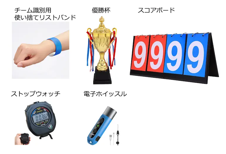 また、得点ボードやチーム分けのためのリストバンド、全体周知のための電子ホイッスル、優勝チームに渡す「優勝杯」なども貸し出します。