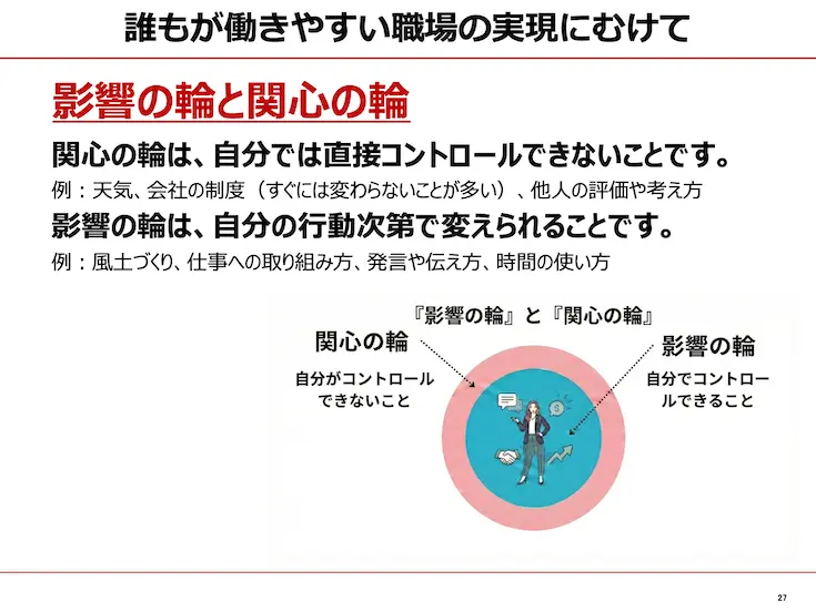 講義パートでは、このワークが会社への不満出しに終わらないように、影響の輪と関心の輪について紹介します。