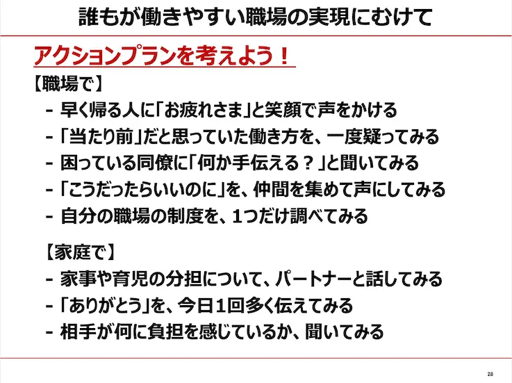 会社への制度の提案は行いつつ、風土の醸成の一端となるようなアクションプランを考えてもらいます。