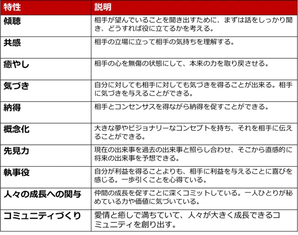 サーバントリーダーシップの10の特性についてはこちらを御覧ください。