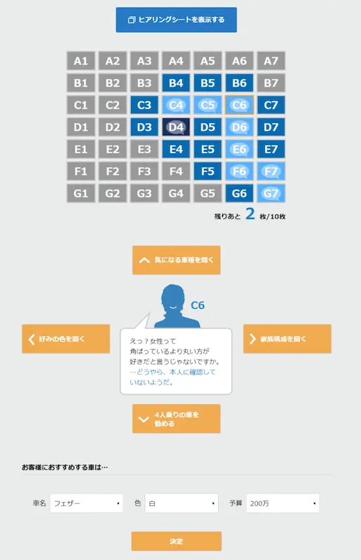 自動車販売のディーラー役となり、顧客にヒアリングをしながら、顧客に最適な車を提案するというゲームです。提案した車が合っていれば購入となります。実施時間は1〜2時間程度。